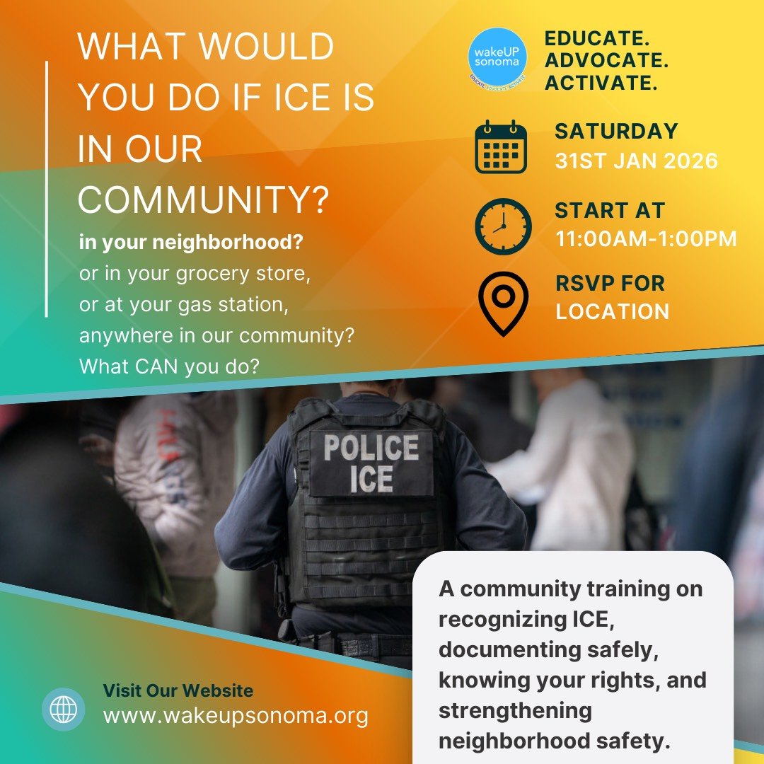 Wake UP Sonoma, in partnership with the North Bay Rapid Response Network, is hosting a community training focused on awareness, safety, and knowing your rights. This training is about learning how to recognize ICE activity, document safely, and respond in ways that protect our neighbors and our community.