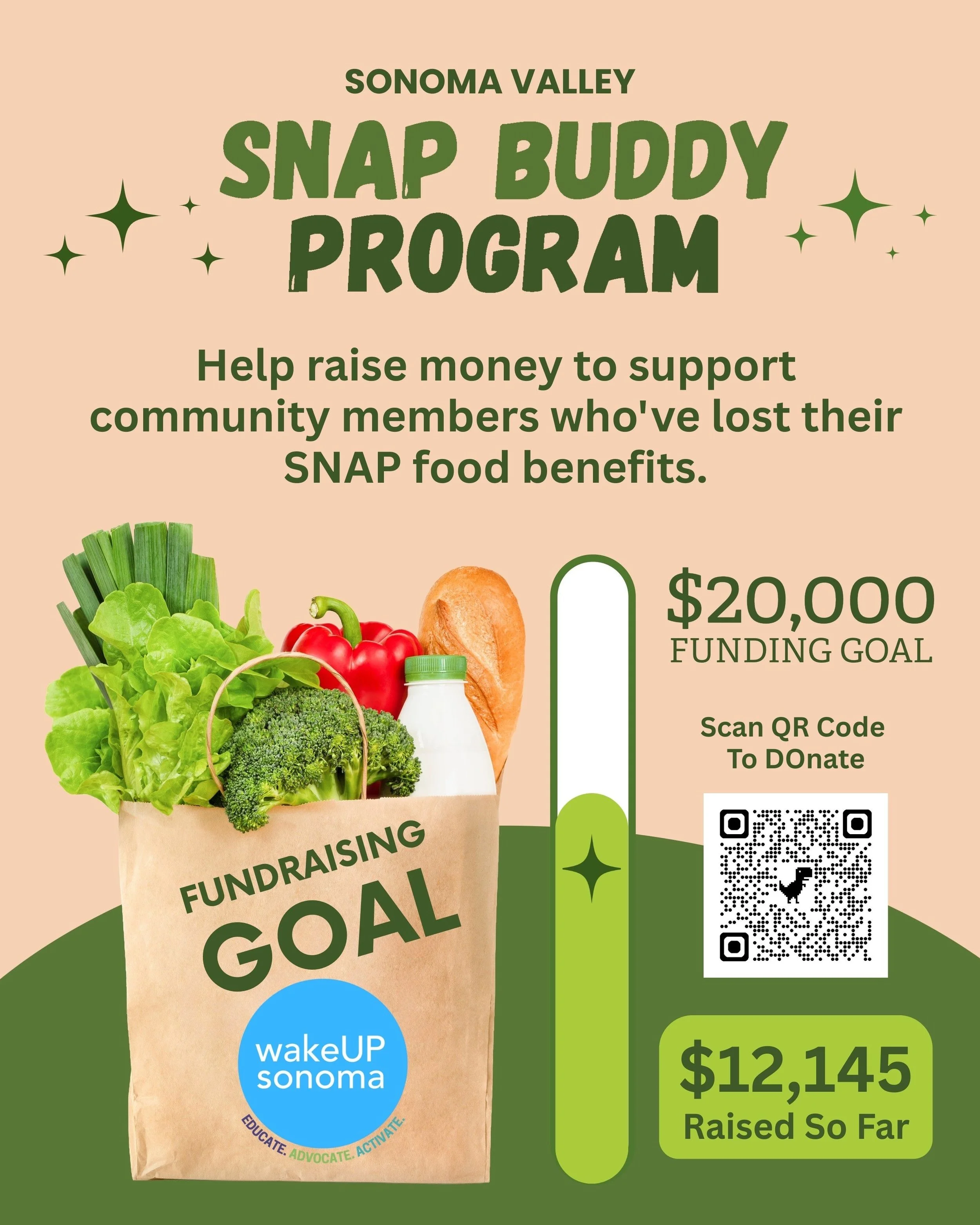 When you donate to WakeUp Sonoma, ensure that you make a note in your transaction that you want the funds to go to “SNAP” so that we can purchase the grocery card.